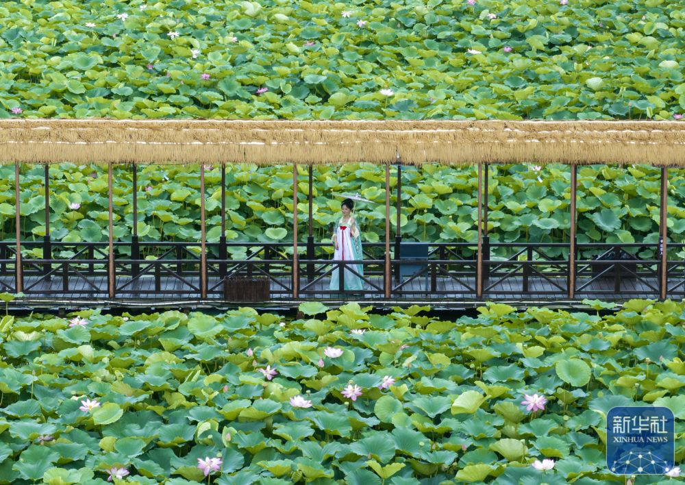 7月3日,游客在江蘇省興化市千垛鎮(zhèn)的萬畝荷塘景區(qū)賞荷游玩(無人機照片)。新華社發(fā)(周社根 攝)