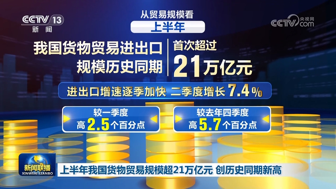 從貿(mào)易規(guī)???,上半年,我國貨物貿(mào)易進(jìn)出口規(guī)模歷史同期首次超過21萬億元。進(jìn)出口增速逐季加快,二季度增長7.4%,較一季度和去年四季度分別高2.5個(gè)、5.7個(gè)百分點(diǎn),貨物貿(mào)易進(jìn)出口質(zhì)量持續(xù)提升、規(guī)模較快增長。