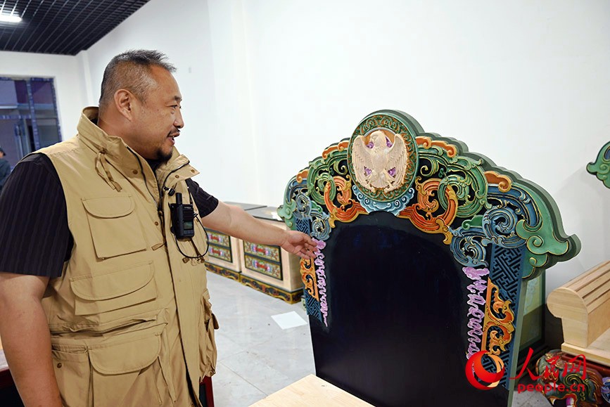 聞都蘇向記者介紹蒙古族家具制作。人民網(wǎng)記者 劉藝琳攝