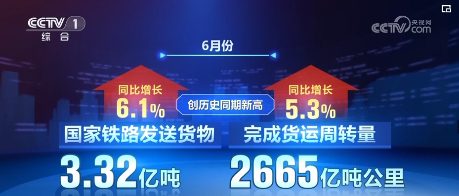 記者7月14日從國鐵集團(tuán)獲悉,6月份,國家鐵路發(fā)送貨物3.32億噸,完成貨運周轉(zhuǎn)量2665億噸公里,同比分別增長6.1%、5.3%,創(chuàng)歷史同期新高。