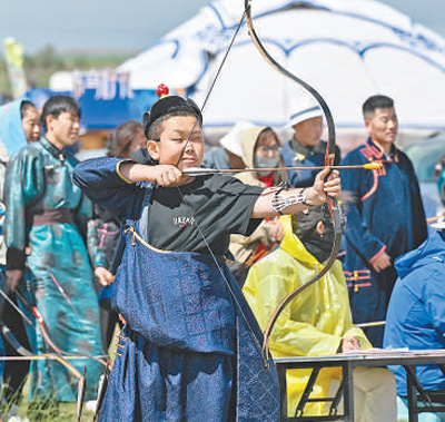 搏克場(chǎng)上,勇士們身姿矯健,近身搏斗;射箭場(chǎng)上,選手們屏息凝神,箭羽破空而出;沙嘎比賽的蒙古包內(nèi),孩童們競(jìng)相投擲,充滿樂趣……遠(yuǎn)處,悠揚(yáng)的馬頭琴聲伴著奶茶醇香,游客們歡聲笑語(yǔ),沉浸在這場(chǎng)體育盛宴中。