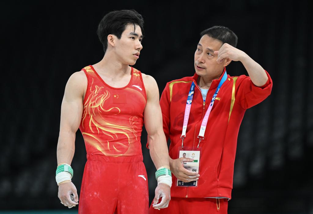 7月24日,中國(guó)男子體操隊(duì)在巴黎進(jìn)行賽臺(tái)訓(xùn)練,中國(guó)隊(duì)選手張博恒(左)在準(zhǔn)備吊環(huán)項(xiàng)目訓(xùn)練。新華社記者 程敏 攝