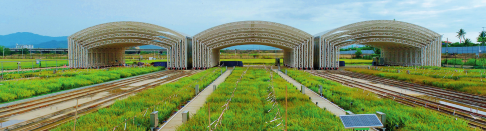 在位于三亞的國家耐鹽堿水稻技術(shù)創(chuàng)新中心崖州灣總部科研試驗(yàn)基地,建設(shè)了高標(biāo)準(zhǔn)試驗(yàn)田、鹽(堿)性精準(zhǔn)鑒定鹽池、自動(dòng)防雨鋼棚、水土鹽堿度智能化監(jiān)測系統(tǒng)等配套設(shè)施(2024年5月17日攝)。黎多江攝/本刊