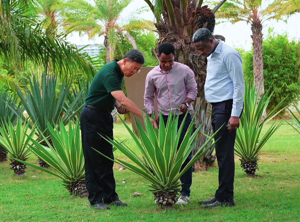 在三亞崖州灣科技城,非洲留學(xué)生跟隨中國熱帶農(nóng)業(yè)科學(xué)院研究員易克賢(左一)在觀察劍麻育種材料長勢(2024年5月17日攝)。黎多江攝/本刊
