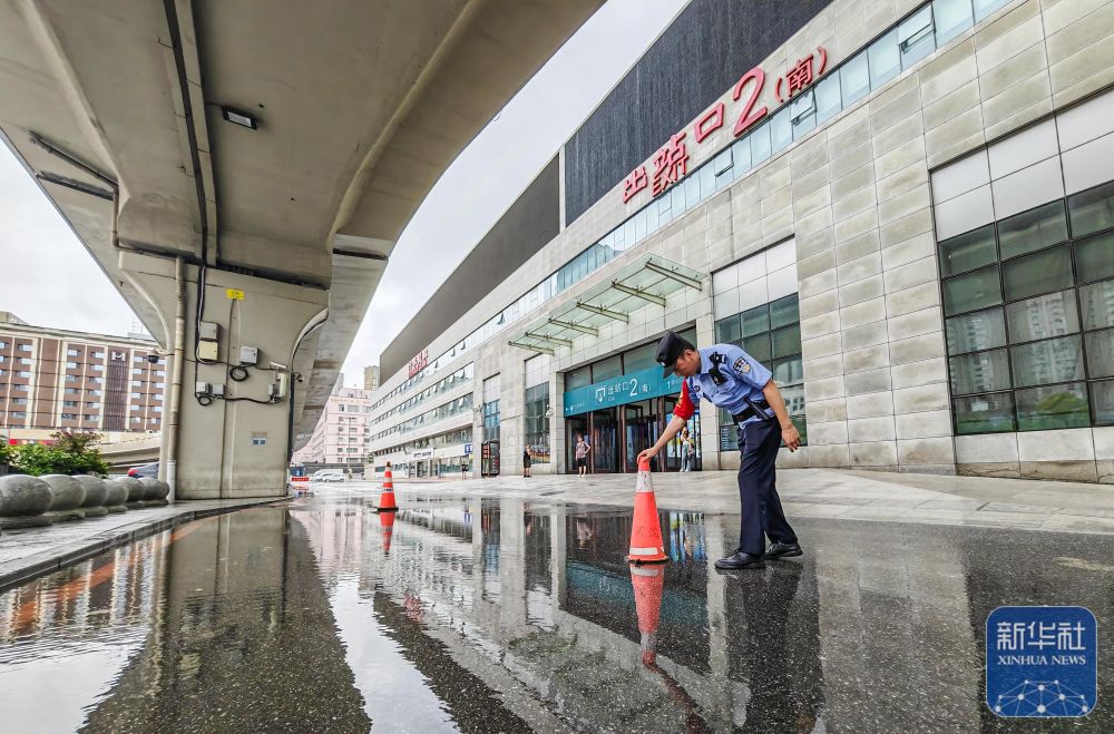 7月28日,在沈陽(yáng)北站,沈陽(yáng)鐵路公安處民警在出站口附近的積水處設(shè)立警示標(biāo)志?! ⌒氯A社發(fā)