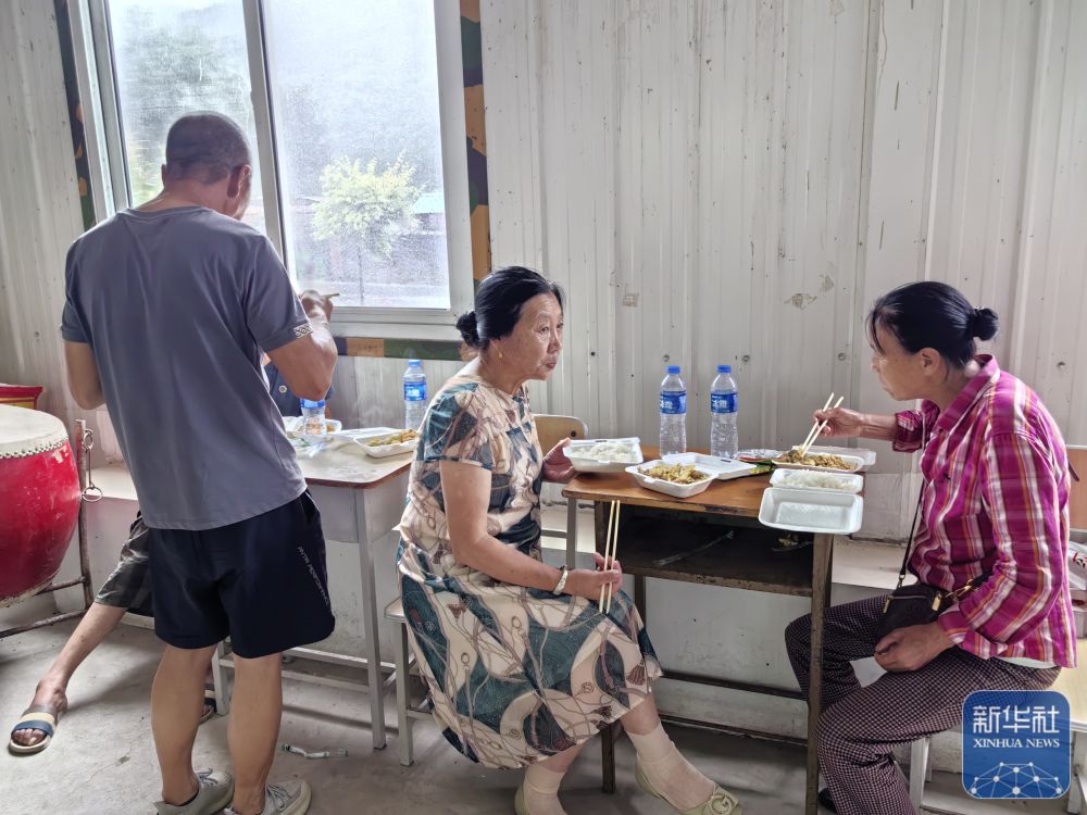 7月27日,在遼寧省鐵嶺縣大甸子鎮(zhèn),受災(zāi)群眾在安置點(diǎn)吃飯?! ⌒氯A社發(fā)
