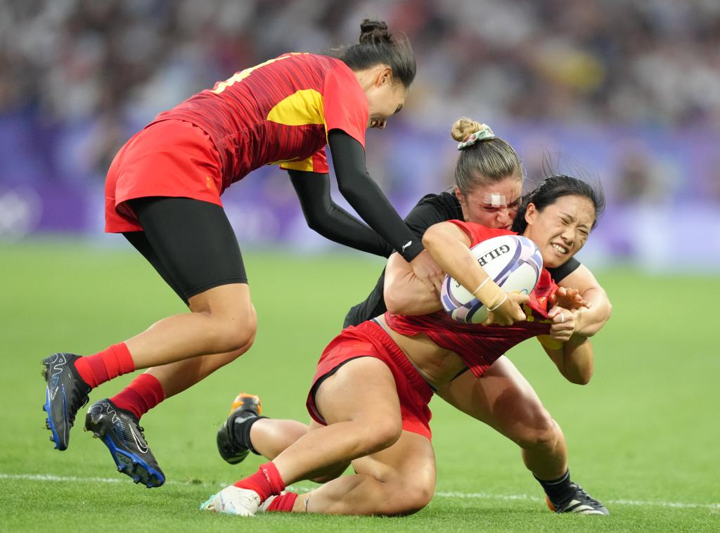 7月29日,中國(guó)隊(duì)球員胡宇(前)在比賽中。 當(dāng)日,在巴黎奧運(yùn)會(huì)七人制橄欖球女子四分之一決賽中,中國(guó)隊(duì)5比55不敵新西蘭隊(duì)。 新華社記者 呂小煒 攝