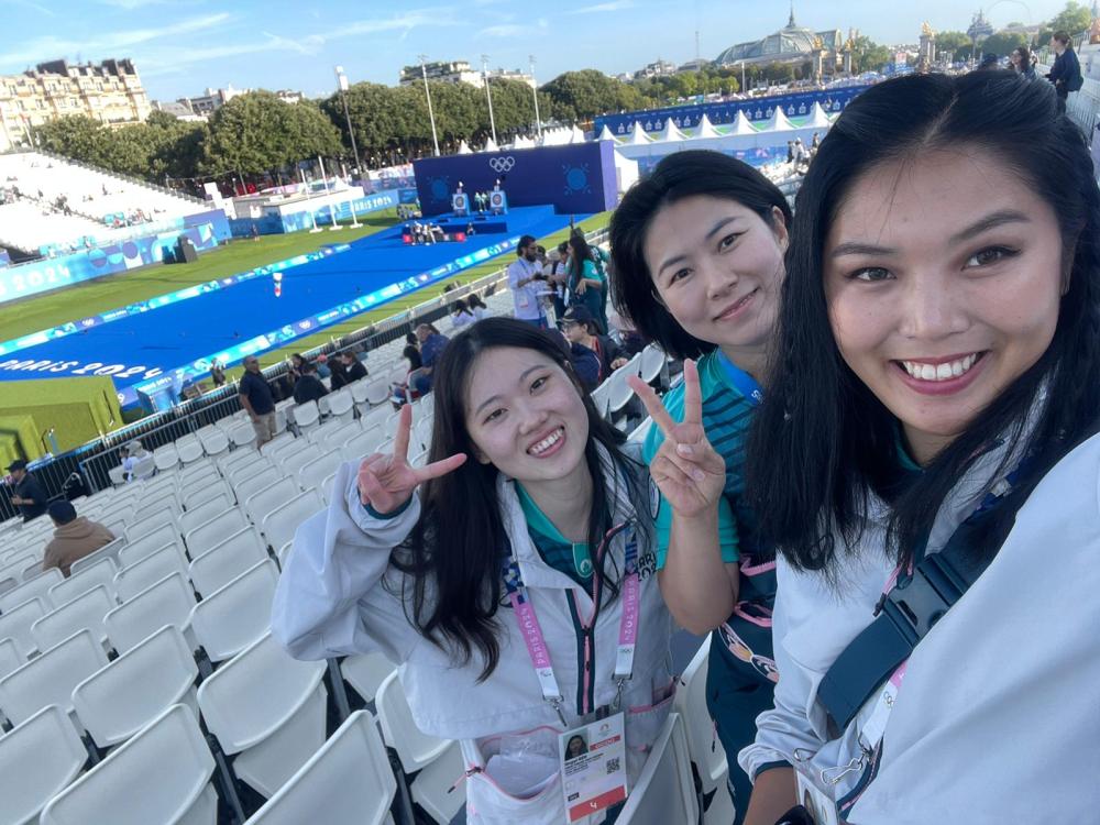 7月28日,中國志愿者任警怡(左一)和韓國志愿者(左二)、日本志愿者(右一)在巴黎奧運會射箭項目場地。(受訪者供圖)