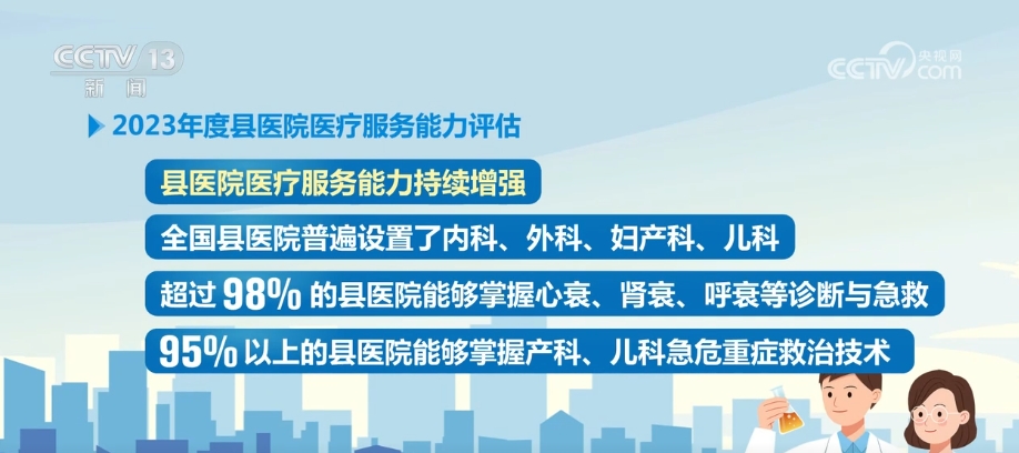 央視網(wǎng)消息:國(guó)家衛(wèi)生健康委29日通報(bào)了2023年度縣醫(yī)院醫(yī)療服務(wù)能力評(píng)估情況,全國(guó)共有2062家縣醫(yī)院參與醫(yī)療服務(wù)能力第三方評(píng)估,縣域覆蓋率達(dá)到98.6%。評(píng)估顯示,全國(guó)有91.85%的縣醫(yī)院符合基本標(biāo)準(zhǔn),也就是相當(dāng)于達(dá)到二級(jí)醫(yī)院能力,其中符合推薦標(biāo)準(zhǔn)達(dá)到三級(jí)醫(yī)院能力的占比超過(guò)一半。