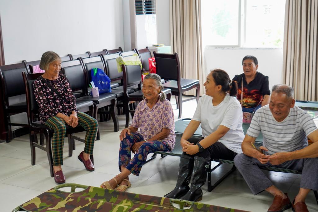 7月30日,富強(qiáng)村村委會辦公點內(nèi),村黨支部書記謝小紅(右二)和被安置的群眾聊天,了解他們的困難和需求。新華社記者 劉潺 攝