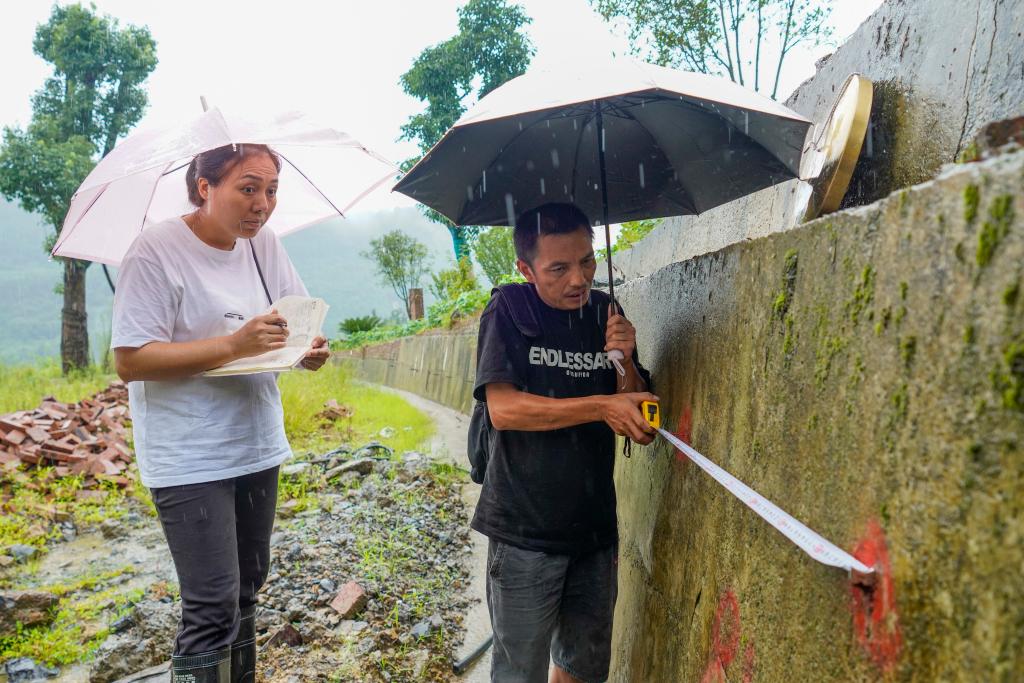 7月30日,富強(qiáng)村村黨支部書記謝小紅(左一)和地質(zhì)災(zāi)害監(jiān)測員魯業(yè)江(右一)一起對富強(qiáng)村一處地質(zhì)災(zāi)害點進(jìn)行測量和監(jiān)測。新華社記者 劉潺 攝