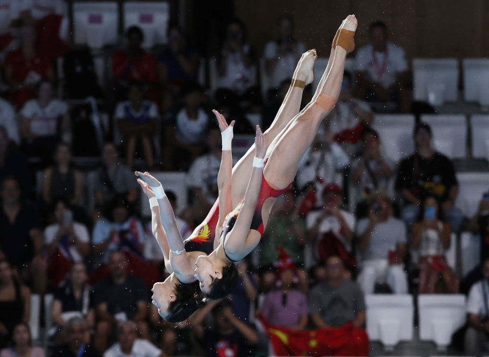 ??7月31日,中國選手陳芋汐(后)/全紅嬋在比賽中。新華社記者 李穎 攝