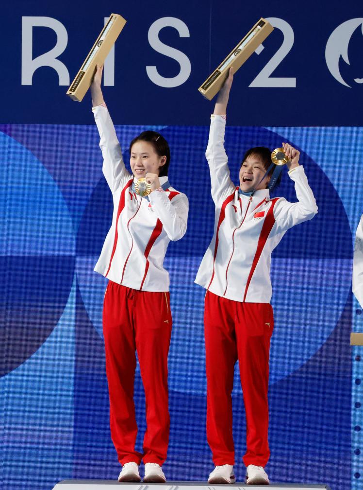 7月31日,冠軍中國選手陳芋汐(左)/全紅嬋在頒獎(jiǎng)儀式上。新華社記者 張玉薇 攝