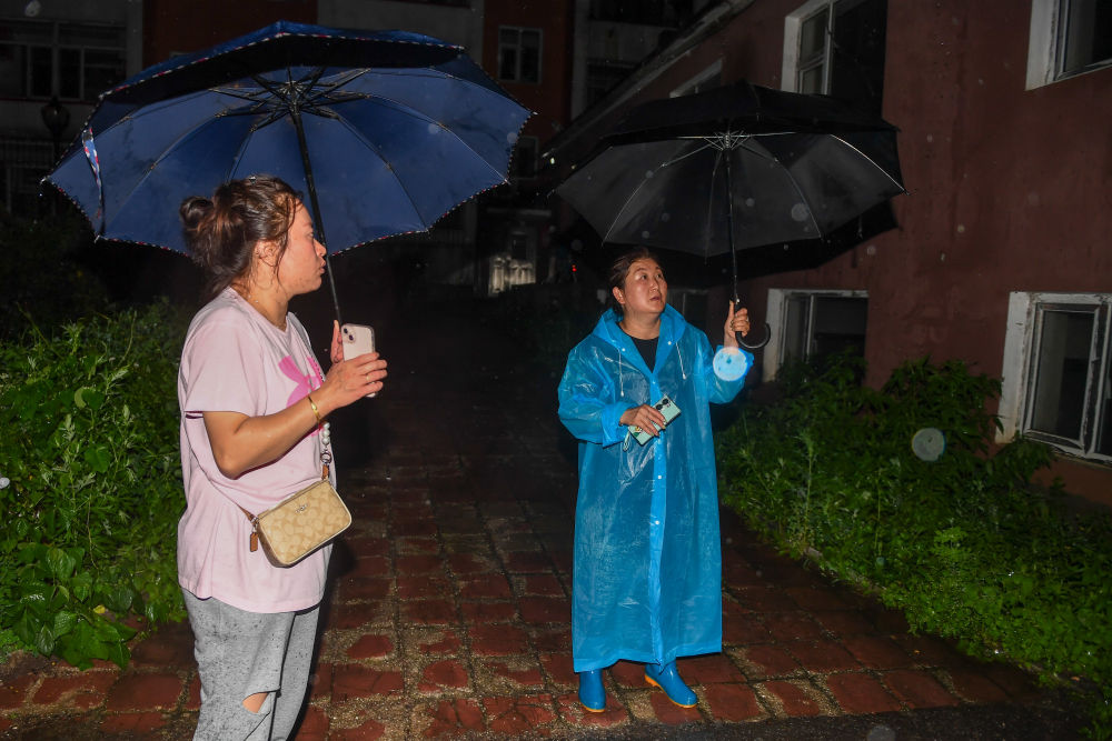 7月29日,在吉林省臨江市,建國街道臺(tái)興社區(qū)黨委書記孫愛武(右)和同事在怡景花園小區(qū)排查人員安置情況。新華社記者 張楠 攝