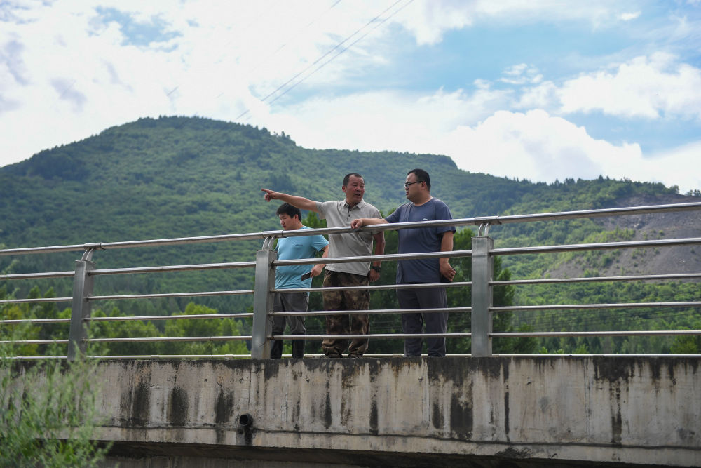 7月31日,在臨城村,金勇誠(右二)帶領(lǐng)臨江市水利局的專家查看受損的供水管道。新華社記者 張楠 攝