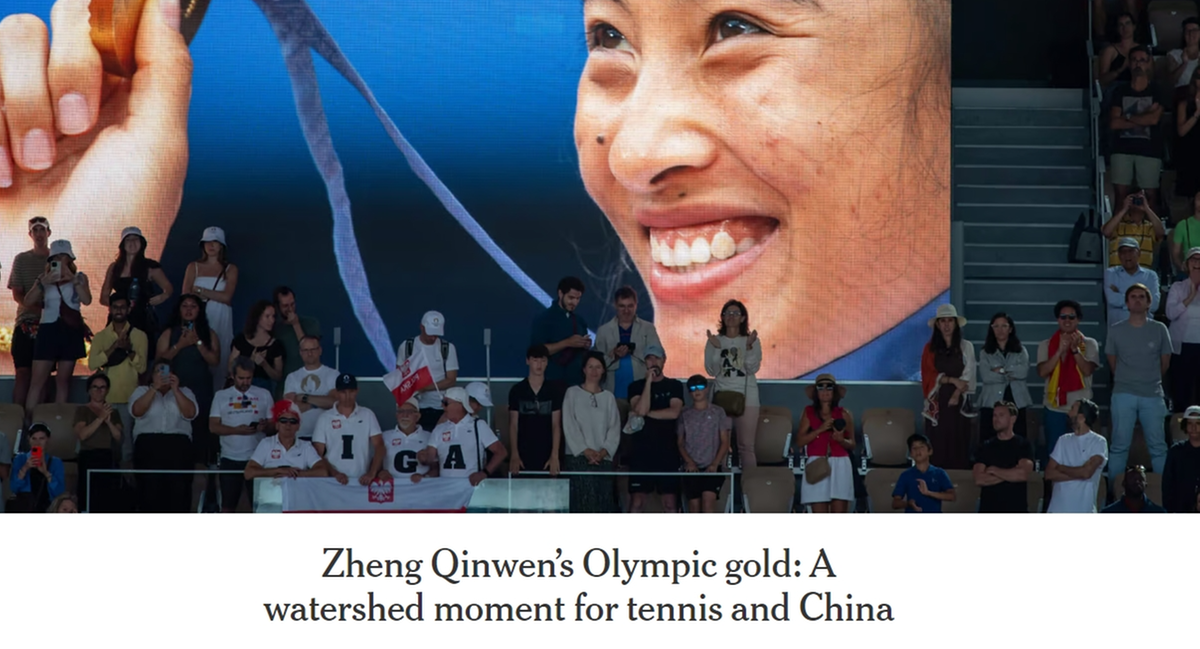 據(jù)美國《紐約時(shí)報(bào)》(NYTimes)當(dāng)?shù)貢r(shí)間4日在對(duì)中國網(wǎng)球選手鄭欽文的專題報(bào)道中寫道,對(duì)于中國網(wǎng)球來說,這只是一個(gè)時(shí)間問題,不是嗎?當(dāng)天凌晨,21歲的鄭欽文奪得巴黎奧運(yùn)會(huì)女子網(wǎng)球單打冠軍,為中國網(wǎng)球奪得了首枚奧運(yùn)女單金牌。