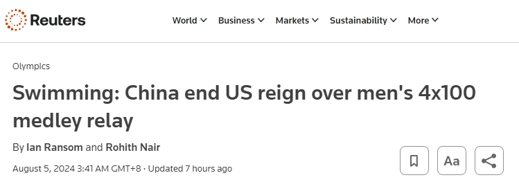 當(dāng)?shù)貢r(shí)間8月4日,在游泳男子4×100米混合泳接力中,中國隊(duì)反超該項(xiàng)目的奧運(yùn)“霸主”美國隊(duì)以及東道主法國隊(duì),以3分27秒46奪冠。英國路透社(Reuters)4日的報(bào)道中寫道,現(xiàn)場歡呼聲震耳欲聾,中國隊(duì)的奪冠結(jié)束了美國隊(duì)64年來的不敗紀(jì)錄。賽后,美國選手萊恩·墨菲(Ryan Murphy)說:“今天中國隊(duì)的表現(xiàn)比我們要更好一些,向中國隊(duì)致敬,他們今晚的表現(xiàn)非常出色?!绷硪幻绹x手亨特·阿姆斯特朗(Hunter Armstrong)則關(guān)注到當(dāng)天是中國選手潘展樂的生日,他表示:“這對(duì)他來說會(huì)是一份很酷的生日禮物!”