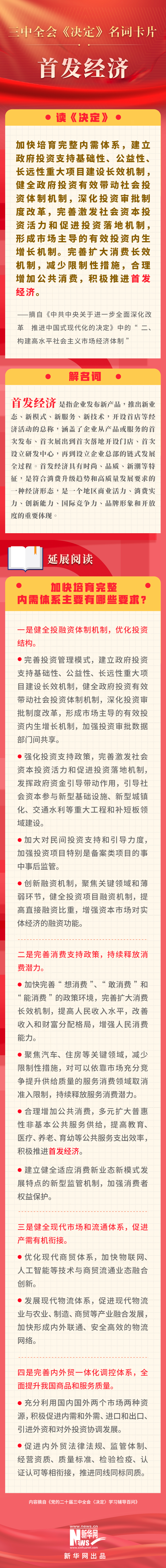 黨的二十屆三中全會(huì)審議通過(guò)了《中共中央關(guān)于進(jìn)一步全面深化改革、推進(jìn)中國(guó)式現(xiàn)代化的決定》。新華網(wǎng)依據(jù)《黨的二十屆三中全會(huì)〈決定〉學(xué)習(xí)輔導(dǎo)百問(wèn)》,制作三中全會(huì)《決定》系列名詞卡片,和大家一起來(lái)深入學(xué)習(xí)領(lǐng)會(huì)二十屆三中全會(huì)精神。本期名詞是“首發(fā)經(jīng)濟(jì)”。
