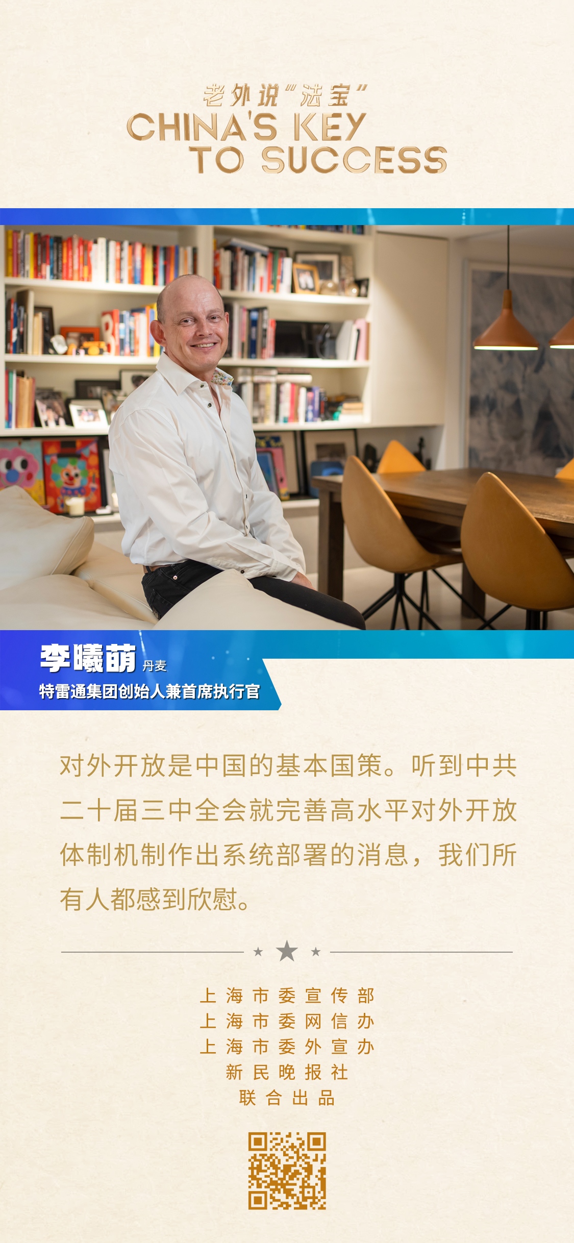 1995年,李曦萌再次回到上海,創(chuàng)辦了特雷通集團(tuán),將北歐家具引進(jìn)中國市場。從那時(shí)起,他便在上海落地生根、成家立業(yè)。李曦萌娶了“上海老婆”,成了“上海女婿”,還熱衷于服務(wù)社區(qū)。李曦萌說,上海是一個(gè)有溫度的城市,希望更多人能夠來上海親身感受這座城市的魅力。