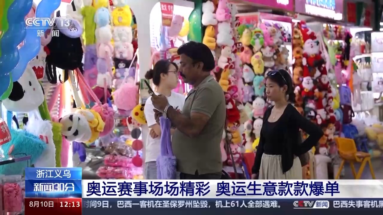 搭乘奧運東風的不僅是體育健兒的同款配飾,奧運周邊產(chǎn)品也備受市場青睞。在義烏國際商貿(mào)城,這里匯集26個大類、210多萬種商品,不僅滿足了全球觀眾和參賽者的需求,也給義烏商家?guī)砹嗣黠@的經(jīng)濟效益。