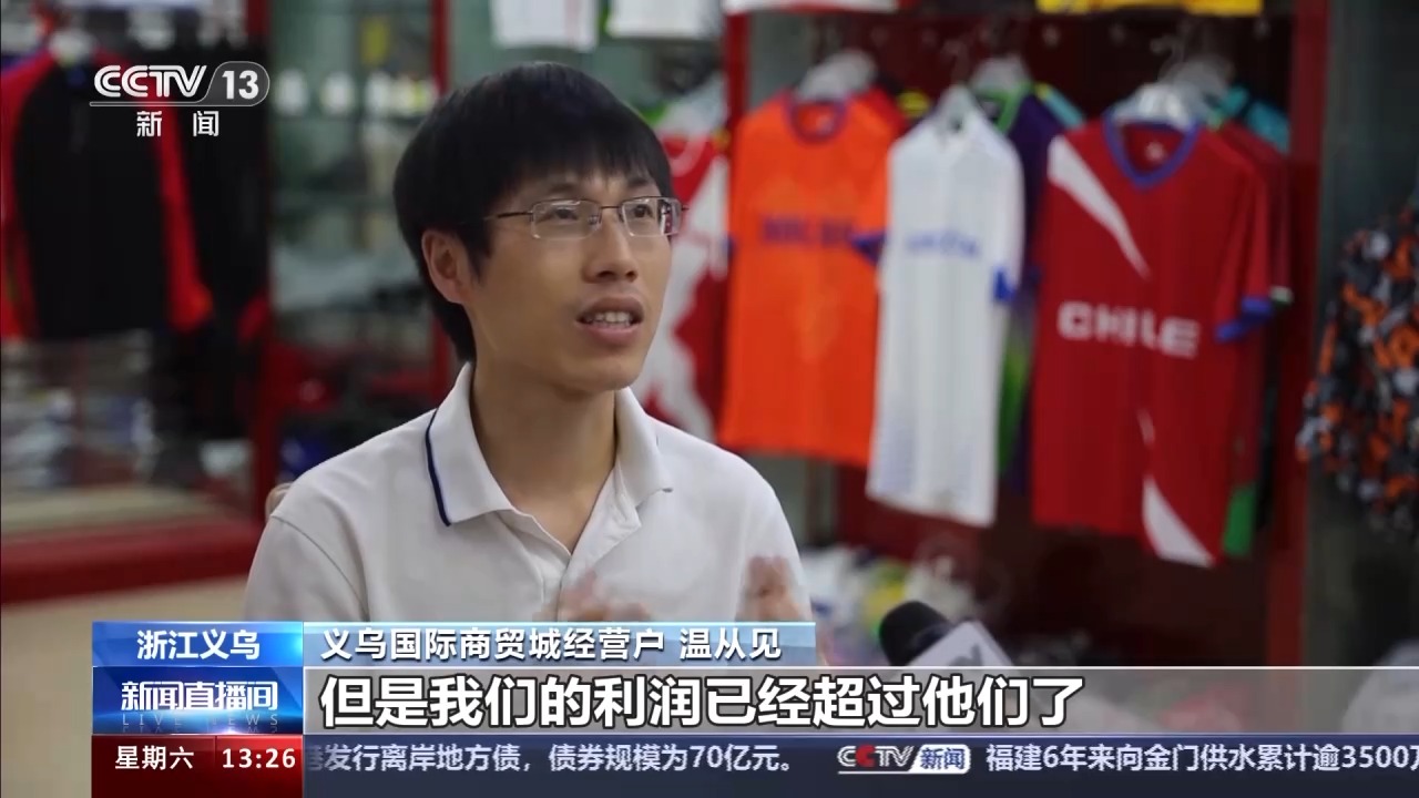 義烏國際商貿(mào)城經(jīng)營戶 溫從見:今年因為是世界大賽年,比如說有歐洲杯、美洲杯、巴黎奧運會,差不多3月份開始,我們就已經(jīng)著手開始接單、打樣、生產(chǎn)這一系列的運動服飾。我們總共3個賽事下來銷了30萬件左右。