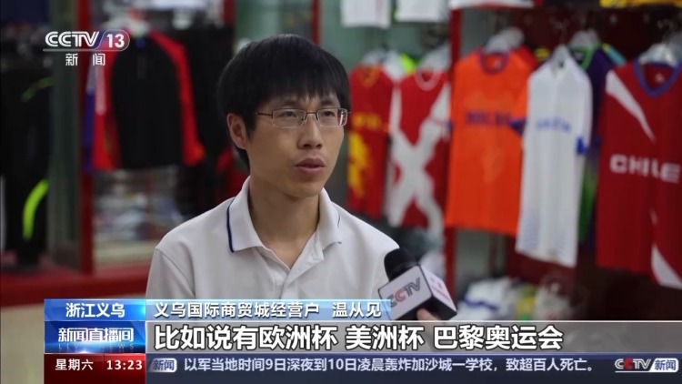 義烏國(guó)際商貿(mào)城經(jīng)營(yíng)戶 溫從見:今年因?yàn)槭鞘澜绱筚惸?,比如說(shuō)有歐洲杯、美洲杯、巴黎奧運(yùn)會(huì),差不多3月份開始,我們就已經(jīng)著手開始接單、打樣、生產(chǎn)這一系列的運(yùn)動(dòng)服飾。我們總共3個(gè)賽事下來(lái)銷了30萬(wàn)件左右。