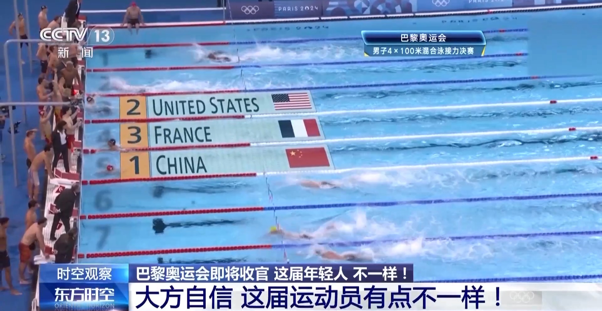 巴黎奧運(yùn)會(huì)游泳賽場(chǎng)最后一個(gè)比賽日,中國(guó)隊(duì)放了個(gè)大招。男子4X100米混合泳接力決賽上,中國(guó)隊(duì)力壓該項(xiàng)目40年“霸主”美國(guó)隊(duì),以3分27秒46的成績(jī)奪冠。