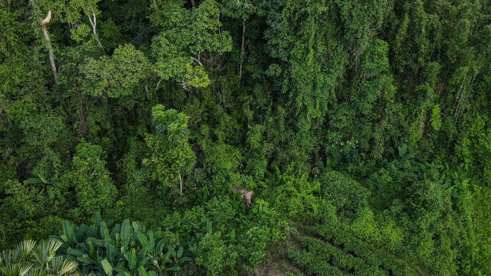 在云南西雙版納國家級自然保護區(qū)勐養(yǎng)片區(qū)邊緣活動的亞洲象阿寶(7月26日無人機照片)。(許團明 攝)