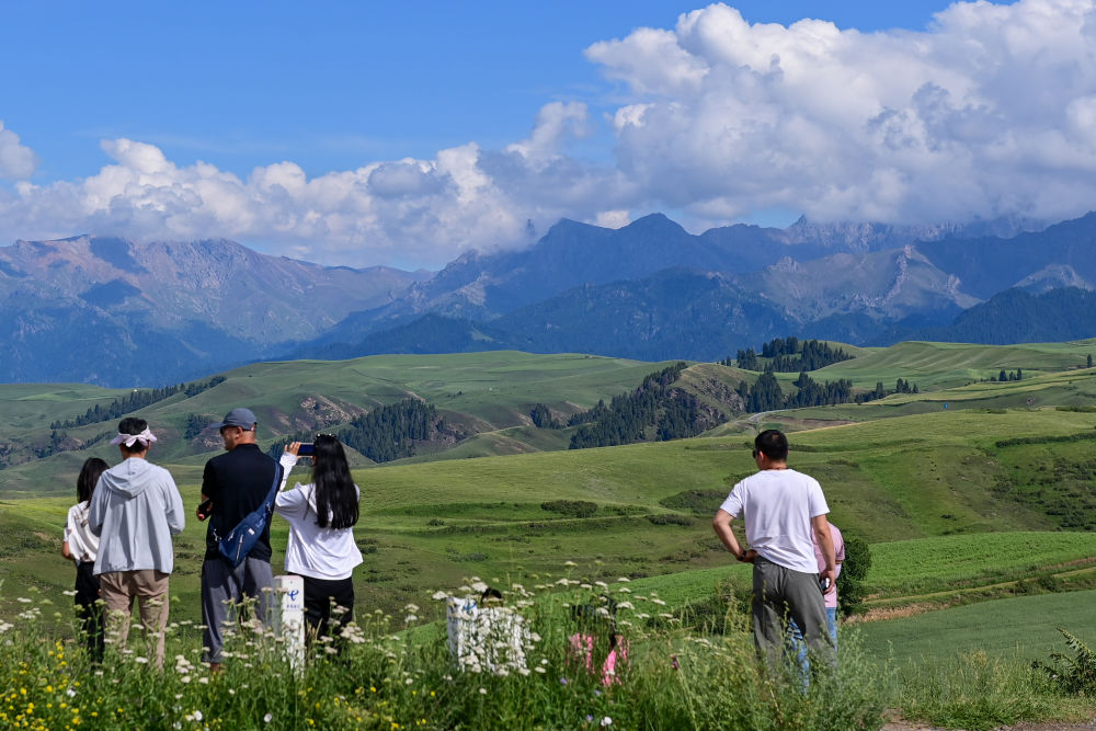 7月10日,在新疆昌吉回族自治州奇臺(tái)縣江布拉克景區(qū),游客在拍攝萬(wàn)畝小麥旱田景觀。新華社記者 丁磊 攝