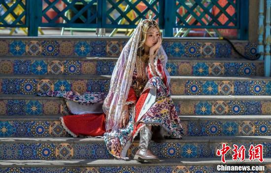 8月12日,新疆烏魯木齊市大巴扎步行街,游客穿著經(jīng)過改進(jìn)的民族服飾拍攝高清寫真照。