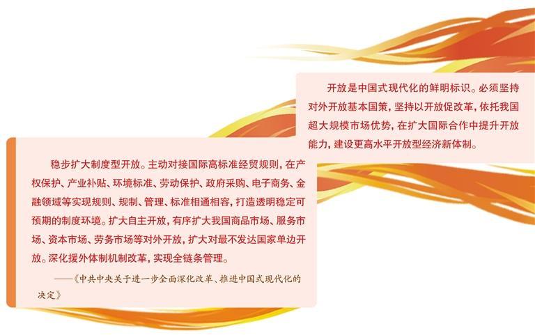 《決定》提出“穩(wěn)步擴(kuò)大制度型開放”,要求主動(dòng)對(duì)接國(guó)際高標(biāo)準(zhǔn)經(jīng)貿(mào)規(guī)則?!稕Q定》作出的一系列重要部署影響廣泛、意義深遠(yuǎn)。