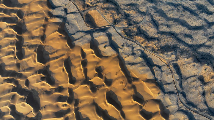 位于寧夏中衛(wèi)市沙坡頭騰格里沙漠邊緣的治沙林帶與沙漠交匯處(2023年9月6日攝,無人機照片)。