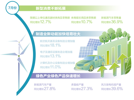 綠色產(chǎn)業(yè)綠色產(chǎn)品快速增長。7月份,新能源汽車產(chǎn)量同比增長27.8%,多晶硅產(chǎn)量同比增長27.3%、風(fēng)力發(fā)電機組產(chǎn)量同比增長39.6%。