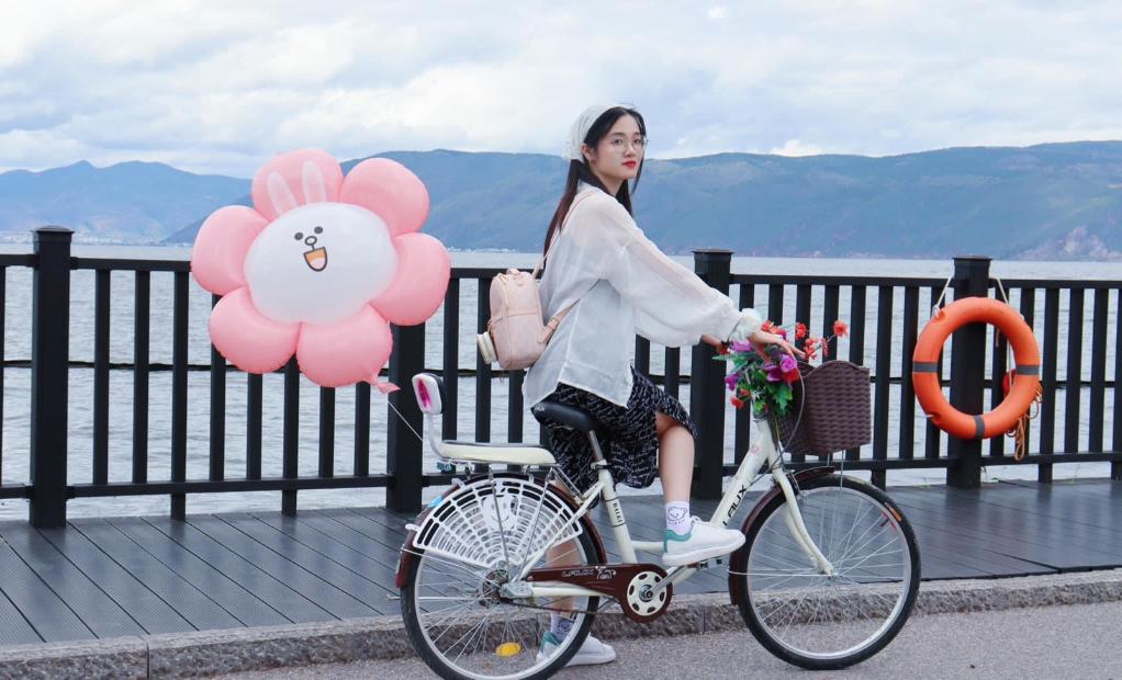7月5日,越南游客在大理洱海邊騎行。新華社記者王賢思 攝