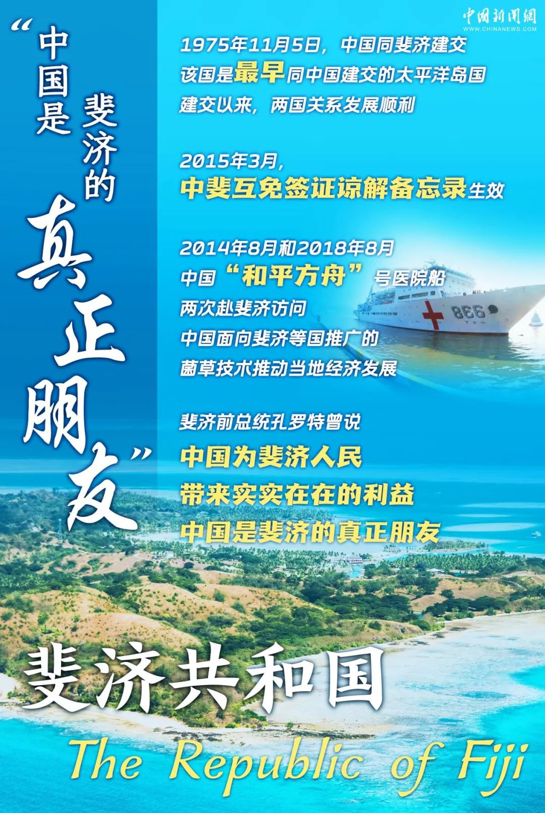 斐濟是最早同中國建交的太平洋島國。中斐建交以來,兩國關(guān)系歷久彌新,各領(lǐng)域交流合作成果豐碩。作為天然的合作伙伴、可靠的真正朋友,中斐兩國攜手共進,帶來更多發(fā)展機遇。