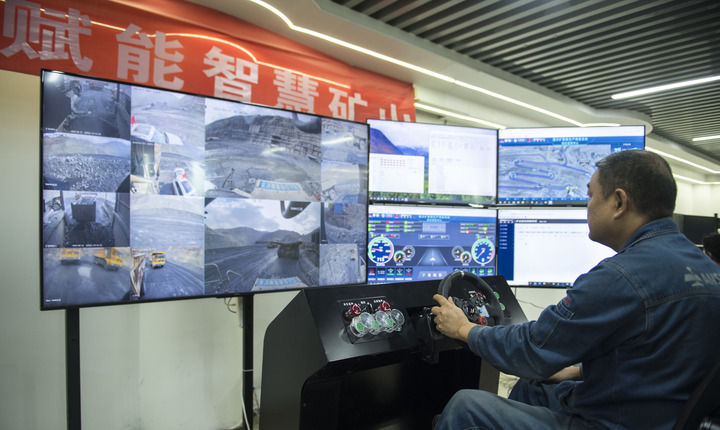 2024年4月11日,技術(shù)人員在位于四川省攀枝花市的攀鋼礦業(yè)朱蘭鐵礦智慧管控中心遠(yuǎn)程操控?zé)o人自動駕駛礦車。新華社記者 張豪夫 攝
