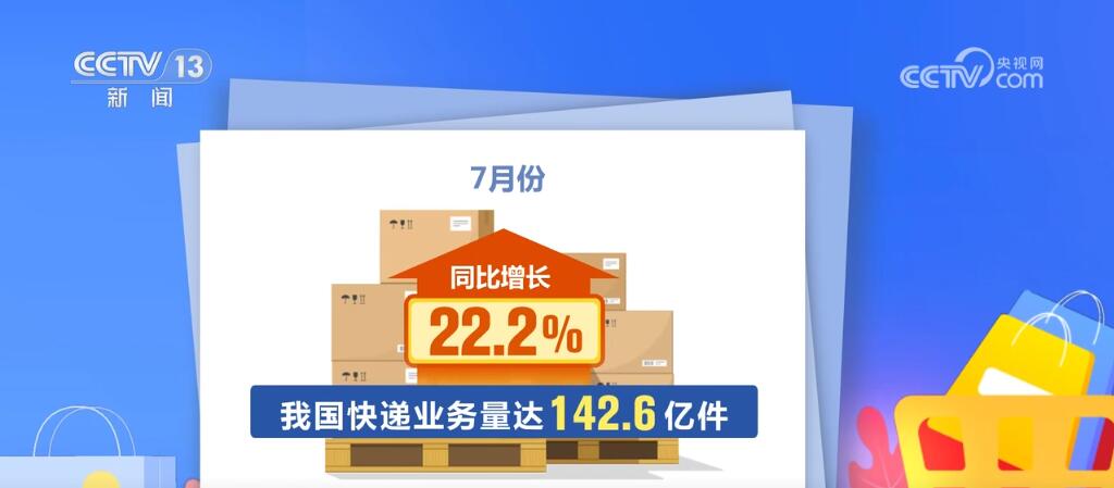 同時,線上消費增勢較好。1—7月,實物商品網(wǎng)上零售額同比增長8.7%,占社零總額比重為25.6%。7月份,我國快遞業(yè)務(wù)量達(dá)142.6億件,同比增長22.2%。