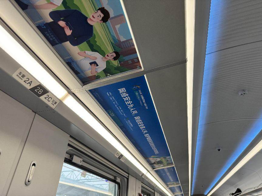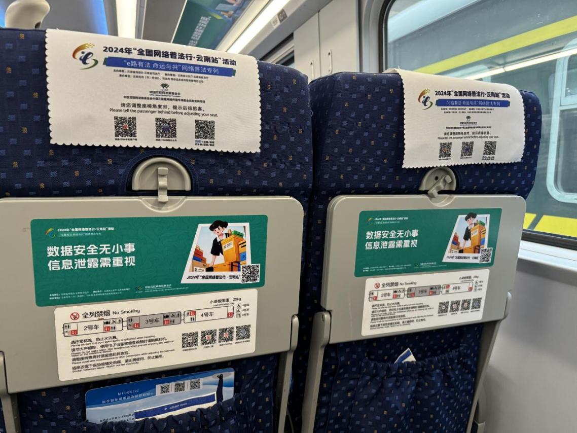 據(jù)介紹,專列的8個(gè)主題車廂分別以“中國(guó)網(wǎng)絡(luò)法治三十年”“網(wǎng)絡(luò)安全”“數(shù)據(jù)安全”“未成年人網(wǎng)絡(luò)保護(hù)”“數(shù)據(jù)出境之旅”“反網(wǎng)暴凈網(wǎng)行動(dòng)”“個(gè)人信息守護(hù)”以及“網(wǎng)絡(luò)空間命運(yùn)共同體”命名,通過鏡框海報(bào)、玻璃貼、小桌板貼、行李架彩貼、頭枕片、車內(nèi)LED信息屏等形式多樣的載體,全面展示網(wǎng)絡(luò)法治30年成就、網(wǎng)絡(luò)空間命運(yùn)共同體主張。讓乘客們?cè)谙硎苁孢m旅途的同時(shí),也能輕松學(xué)習(xí)到實(shí)用的法律信息。