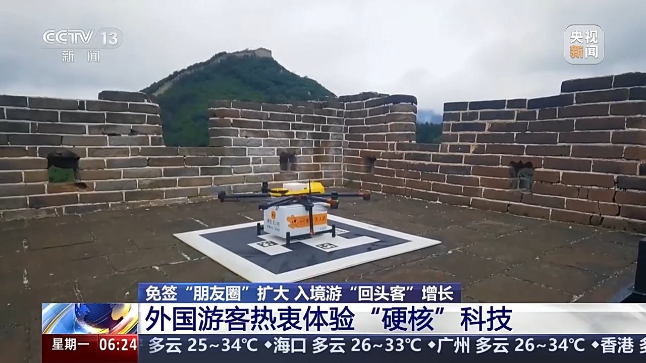 北京八達嶺長城近期開通了無人機“送外賣”服務,最快5分鐘,來自山下的酸梅湯、雪糕、創(chuàng)可貼等商品就能送到長城上來。
