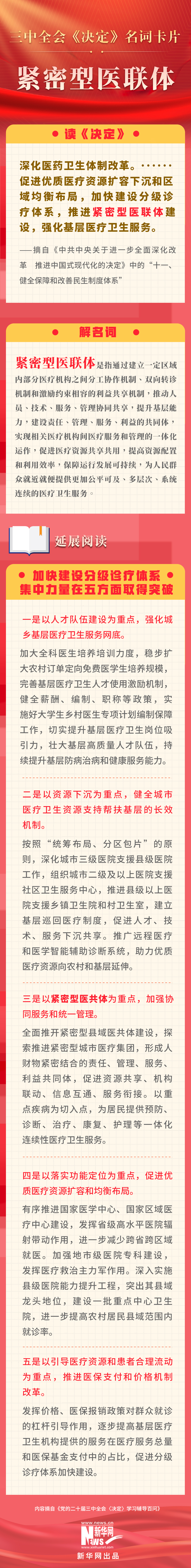 黨的二十屆三中全會(huì)審議通過(guò)了《中共中央關(guān)于進(jìn)一步全面深化改革、推進(jìn)中國(guó)式現(xiàn)代化的決定》。新華網(wǎng)依據(jù)《黨的二十屆三中全會(huì)〈決定〉學(xué)習(xí)輔導(dǎo)百問(wèn)》,制作三中全會(huì)《決定》系列名詞卡片,和大家一起來(lái)深入學(xué)習(xí)領(lǐng)會(huì)二十屆三中全會(huì)精神。本期名詞是“緊密型醫(yī)聯(lián)體”。