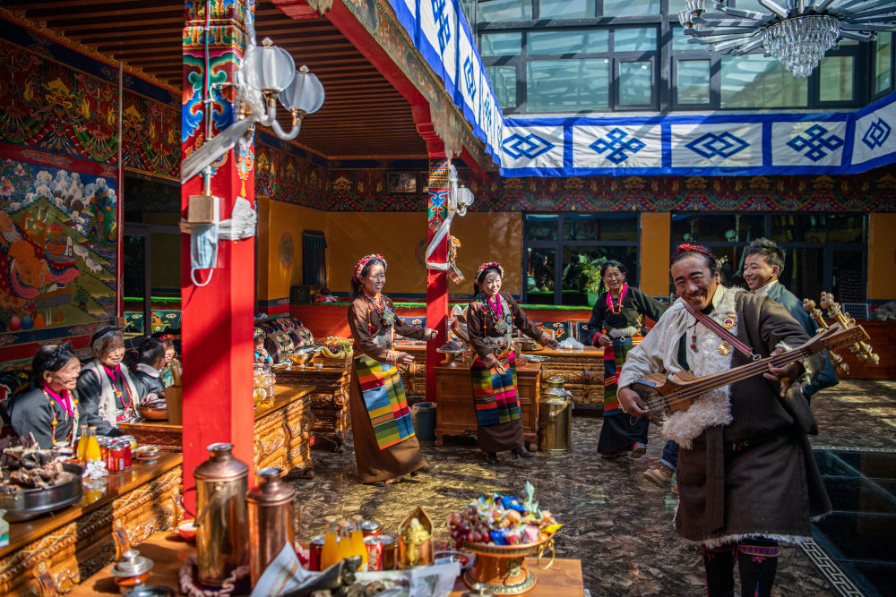 2023年1月22日,在位于西藏日喀則拉孜縣扎西宗鄉(xiāng)雜村的家中,次旦老人的兒孫們一邊彈扎念琴一邊跳舞,慶祝藏歷農家年。新華社記者 孫非 攝