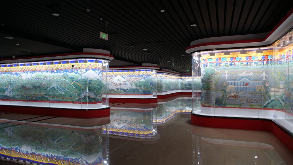 日喀則非物質文化遺產展示中心里展覽的新題材唐卡(2024年5月7日攝)。新華社記者 邱星翔 攝