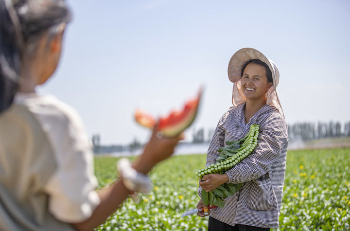 在寧夏青銅峽市瞿靖鎮(zhèn)毛橋村蔬菜基地,來自貴州的苗族務工人員楊文高(右)在采收間隙和女兒聊天(2024年8月23日攝)。新華社記者 楊植森 攝