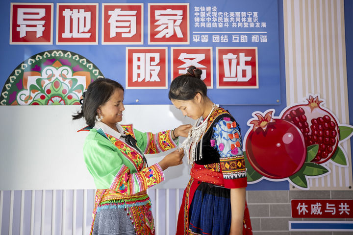 在寧夏青銅峽市瞿靖鎮(zhèn)毛橋村“異地有家”服務站,來自貴州的苗族務工人員楊文高(左)在給放暑假的大女兒整理服飾。楊文高將民族服飾從老家?guī)У綄幭模诠ぷ髦嗑蜁┥厦褡宸棧?024年8月23日攝)。新華社記者 楊植森 攝