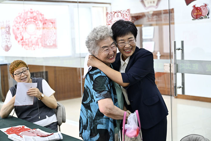 寧夏銀川市金鳳區(qū)長城花園社區(qū)書記趙耐香(右一)在社區(qū)“才藝堂”與居民交流(2024年6月20日攝)。新華社記者 王鵬 攝