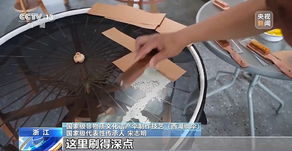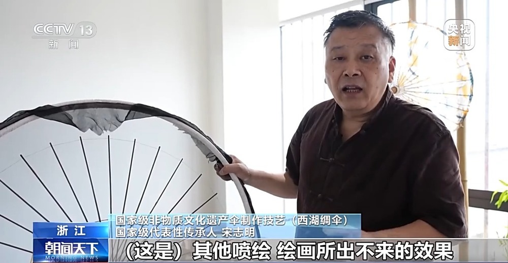 國(guó)家級(jí)非物質(zhì)文化遺產(chǎn)傘制作技藝(西湖綢傘)國(guó)家級(jí)代表性傳承人 宋志明:刷出來(lái)的圖案有靈動(dòng)感,這是其他噴繪、繪畫(huà)所出不來(lái)的效果,特別是在絲綢傘面上來(lái)畫(huà),通過(guò)顏料的霧狀,刷花呈現(xiàn)的效果是獨(dú)一無(wú)二的。