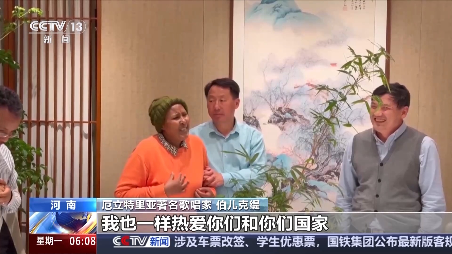 厄立特里亞著名歌唱家 伯兒克緹:你們拯救了我的生命,給予了我新生命,我熱愛(ài)我的國(guó)家,我也一樣熱愛(ài)你們和你們國(guó)家。我也希望邀請(qǐng)你們?nèi)ノ业膰?guó)家做客,我愛(ài)你們。