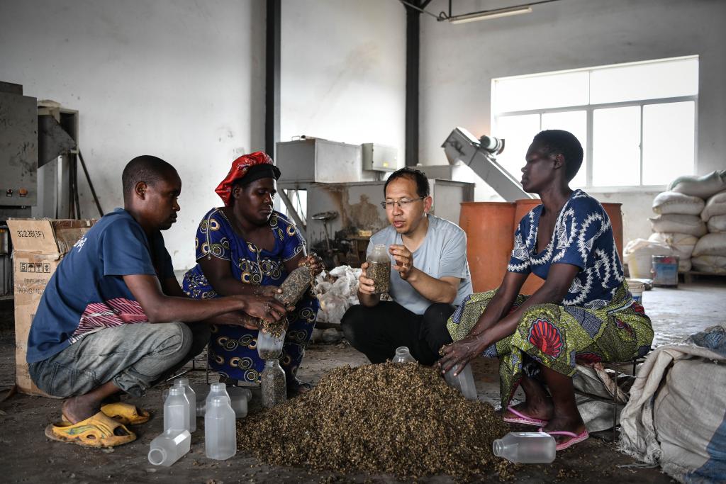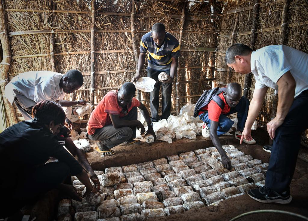 8月13日,在盧旺達南方省胡耶區(qū)的中國援盧農(nóng)業(yè)技術示范中心,菌草專家陳曉斌(右二)與當?shù)剞r(nóng)民一起制作菌種培養(yǎng)料。