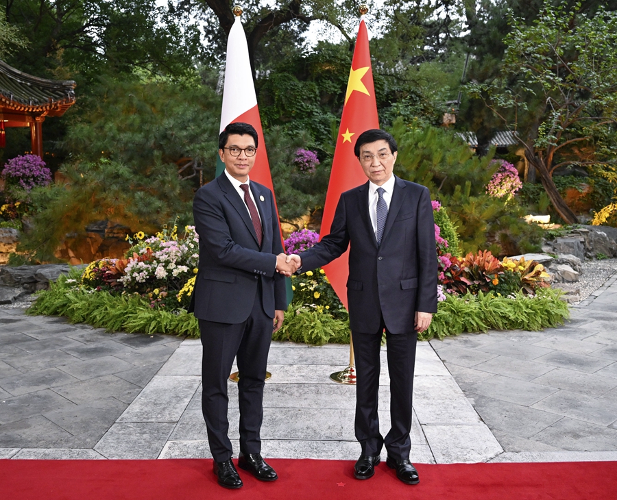 9月6日,全國政協(xié)主席王滬寧在北京會見來華出席中非合作論壇北京峰會的馬達(dá)加斯加總統(tǒng)拉喬利納。新華社記者 申宏 攝