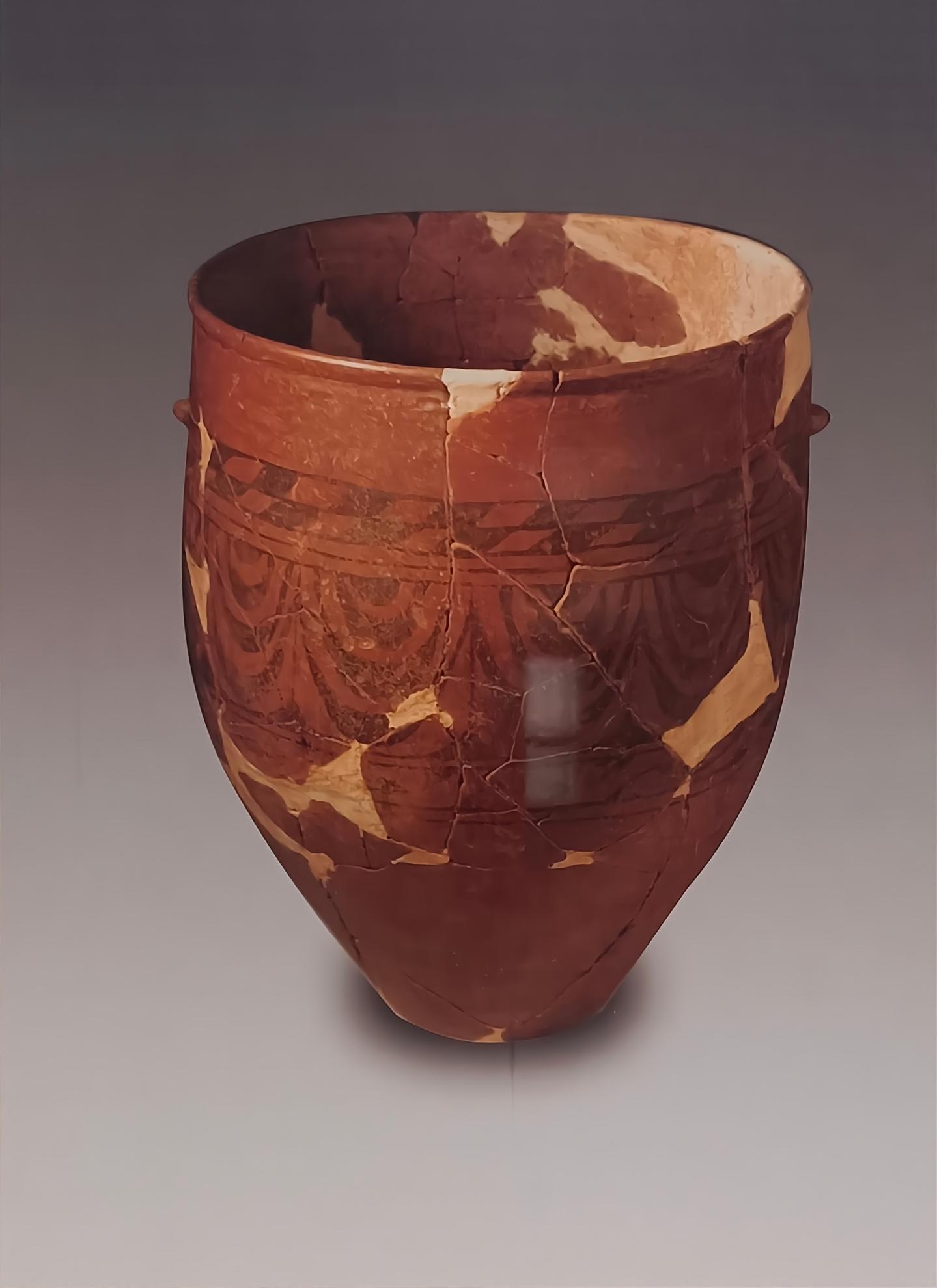曾在赤峰博物館展出的紅山文化出土陶器中,還有一件融合了三種文化元素的陶罐,這就是20世紀70年代在赤峰市阿魯科爾沁旗紅山文化遺址中發(fā)掘出土的大型細泥紅陶彩繪平底筒形罐。它如同一部無聲的史詩,告訴世人在五千多年前的紅山,曾經上演過怎樣的文明交融。